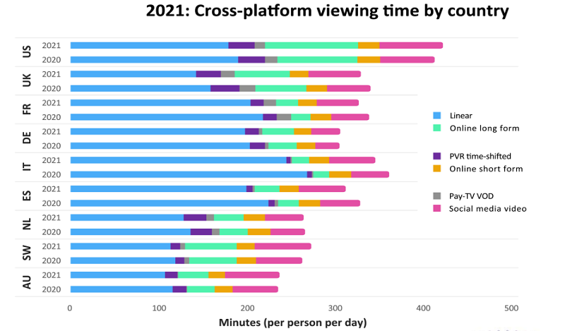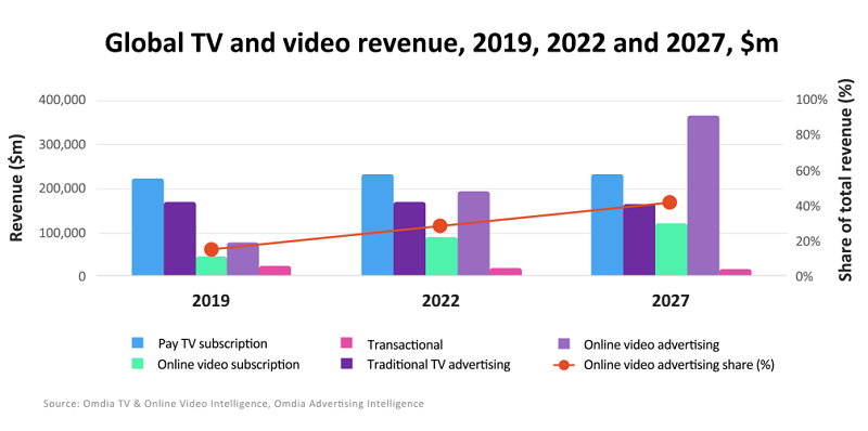 Podle prognózy společnosti Omdia se reklamní příjmy z online TV a videa (catch-up, streaming) do roku 2027 téměř zdvojnásobí a vysílatelé z ní budou získávat více až trojnásobek toho, co od předplatitelů streamovacích služeb. „Trh předplatného je nasycený, je to cyklus, který se pravidelně opakuje. Diváci přecházejí na předplatné, pak už nechtějí platit a vrací se,“ popsal Paul Gray z Omdia. Domnívá se rovněž, že pro budoucnost se ukazují jako funkční hybridní modely reklamy a předplatného a že výraznější roli budou mít také příjmy z gamingu. Jedničkou sledovanosti pak stále zůstává lineární TV a příjmy z lineární TV reklamy tvoří stále většinu celkových příjmů vysílatelů.