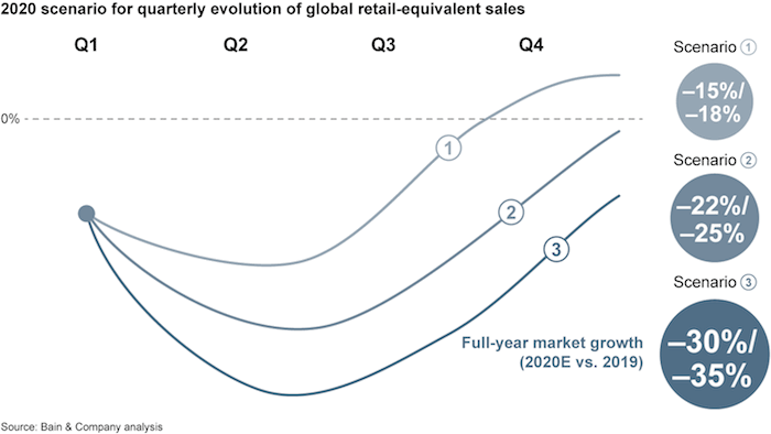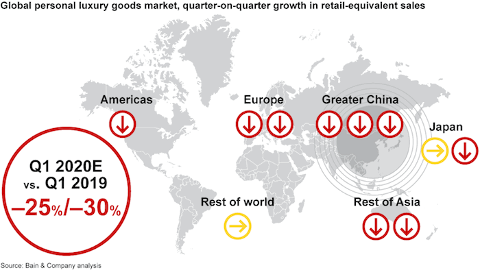 Dle prognózy Bain & Company mělo dojít na poli luxusního zboží v prvním čtvrtletí letošního roku k poklesu tržeb o 25 až 30 %. V porovnání s krizí z roku 2002 až 2003, způsobené epidemií SARS, a s finanční krizí v roce 2008 bude mít ta současná na trh s luxusem mnohem drtivější dopad. Je to dáno jednak tím, že čínští spotřebitelé jsou pro luxus v současnosti mnohem důležitější než před 18 lety, jednak tím, že strach z budoucnosti je nyní větší než dřív. V neposlední řadě se na celé situaci negativně podepíšou i omezené možnosti cestování.