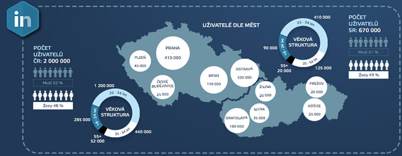 Z hlediska rozdělení na muže a ženy je toto zastoupení na LinkedInu více méně totožné (52 % ve prospěch mužů) a nejvíce českých uživatelů je z Prahy (410 000), Ostravy (330 000) a Brna (110 000).