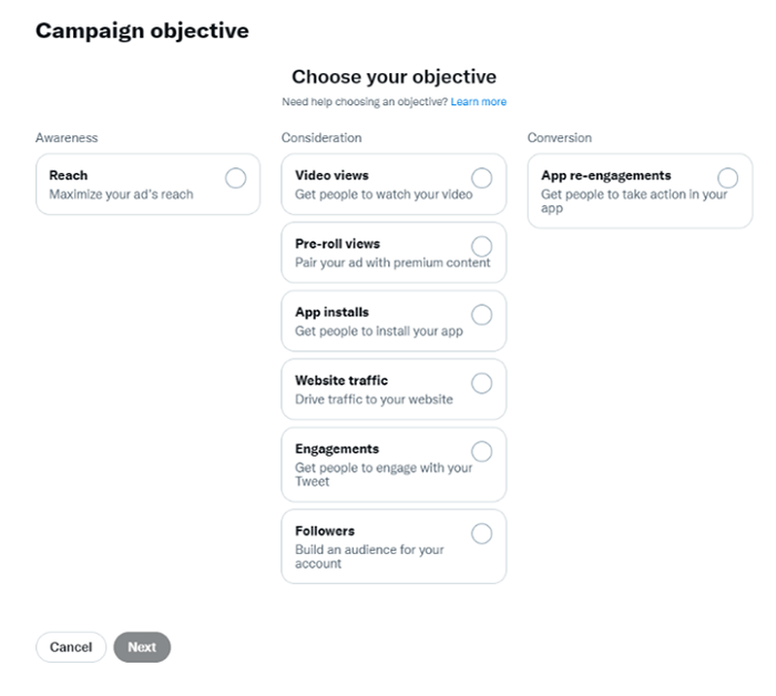Krokem číslo jedna je zvolení si účelu své reklamy. Twitter nabízí hned osm účelů, které se o moc neliší od účelů na ostatních sociálních platformách. Zmiňme účel maximálního zásahu, zhlédnutí videí, prokliků na web, interakcí nebo instalace aplikací. Také na Twitteru si můžete udělat akviziční kampaň na nábor nových followerů vašeho kanálu.