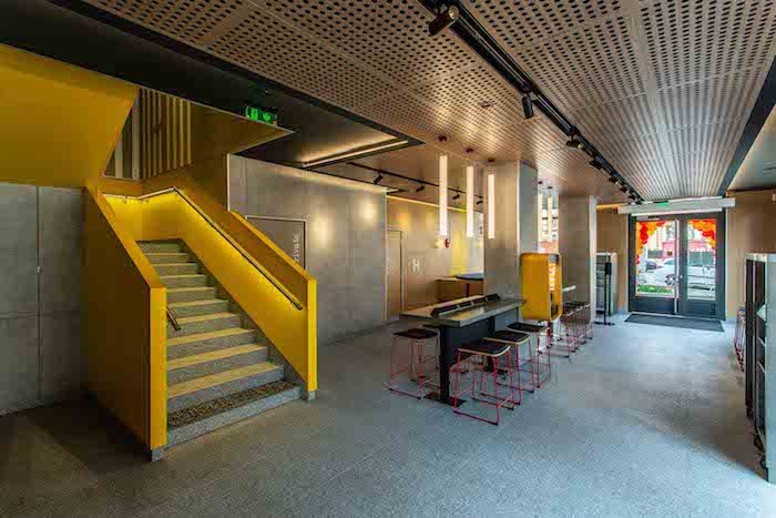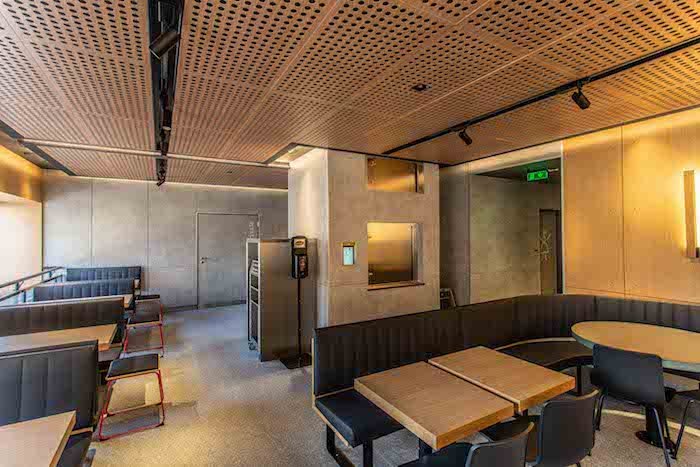 V interiéru propojuje restaurace dřevěné materiály spolu s ocelí, zinkovými a ocelovými prvky se skleněnými doplňky, to vše s atmosférickým osvětlením.