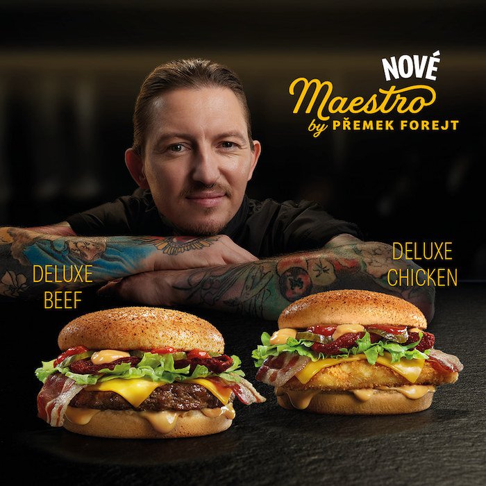 McDonald’s opět uvádí Maestro burgery, jejichž nová receptura vznikla pod taktovkou šéfkuchaře Přemka Forejta. Ten připravil menu s hovězím a kuřecím masem, které doplňuje slanina, čedar, salát, okurky, sušená rajčata a dvě omáčky – McBacon a Tomato Chargrill. Kuřecí je marinováno v podmáslí.