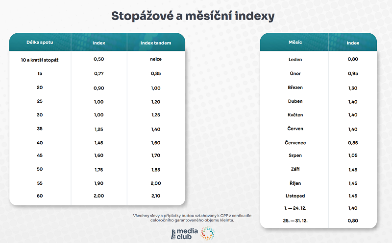 Klienti Media Clubu mohou stejně jako v předchozích letech získat motivační slevy u televizních kampaní. Těm, kteří uzavřou objednávku kampaní na rok 2023 do 1. 12. 2022, bude aplikován off prime time koeficient na úrovni 0,85 a prime time index na úrovni 1,05. Ti, kteří uzavřou závazky na rok 2023 do 12. ledna, získají off prime time index 0,90 a prime time index na úrovni 1,05.