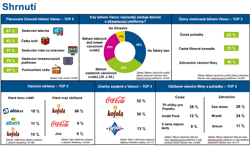Většina (83 %) dotázaných, kteří během vánočních svátků sledují televizi či streamovací platformy, ráda sleduje české pohádky. Pro 69 % respondentů jsou oblíbeným žánrem během Vánoc české filmové komedie a pro 46 % dotázaných zahraniční vánoční filmy. Zhruba třetina dotázaných také ráda sleduje jiné české filmy a seriály.