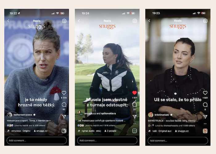 Menstruační kalhotky Snuggs se v kampani spojily s moderátorkou Lindou Bartošovou a společně vyzpovídaly tenistku Barboru Strýcovou, golfistku Kláru Spilkovou a česko-finskou běžkyni Kristiinu Mäki. V rozhovorech otevřeně mluví o tom, jak menstruace ovlivňuje jejich výkony, jak dokáže přepisovat výsledkové listiny.