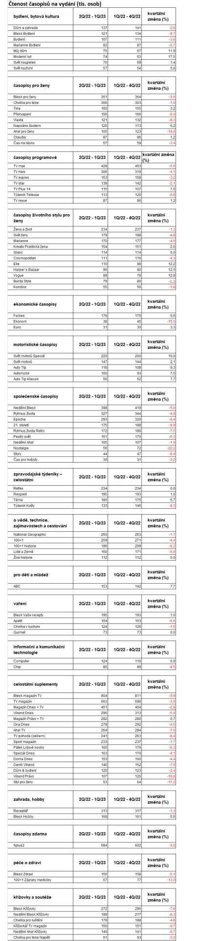 Ve srovnání s posledními daty za celý rok 2022 si polepšily zejména motoristické časopisy na čele s magazínem Svět motorů Speciál (CNC), kde se čtenost zvýšila všem sledovaným časopisům. Dařilo se i módním magazínům Elle (Burda), Vogue (V24 Media) a Harper's Bazaar (Mafra), které si připsaly dvouciferné navýšení. To platí i o některých časopisech o bydlení – především Moderní byt (Business Media CZ) a také Můj dům (Business Media One).