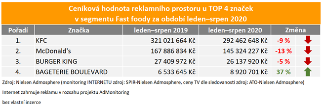 Řetězec rychlého občerstvení KFC vynaložil za letošní období leden až srpen 2019 podle monitoringu investic nejvyšší částky na reklamu v médiích. Ukazují to data společnosti Nielsen Admosphere. Druhým nejsilnějším v segmentu je McDonald’s.