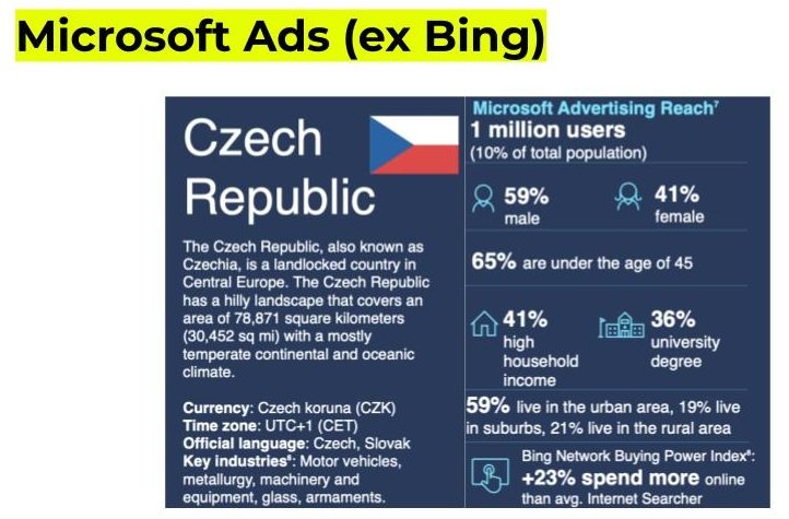 Další z možností dostupných českým zadavatelům jsou Microsoft Ads, tedy jakýsi pohrobek kdysi ambiciózního vyhledávače Bing. Ale stačí si uvědomit, kolik lidí aktivně využívá prohlížeč Edge. Proto když víme, kde je možné tuto reklamu spouštět, dovolím si odhadnout, že kvůli tak malé audienci půjde jen velmi obtížné zacílit některou specificky zaměřenou kampaň. Navíc Microsoft disponuje jen velmi malým množstvím ostatních reklamních ploch, takže v tento moment považujeme tuto platformu za čistě performance kanál.
