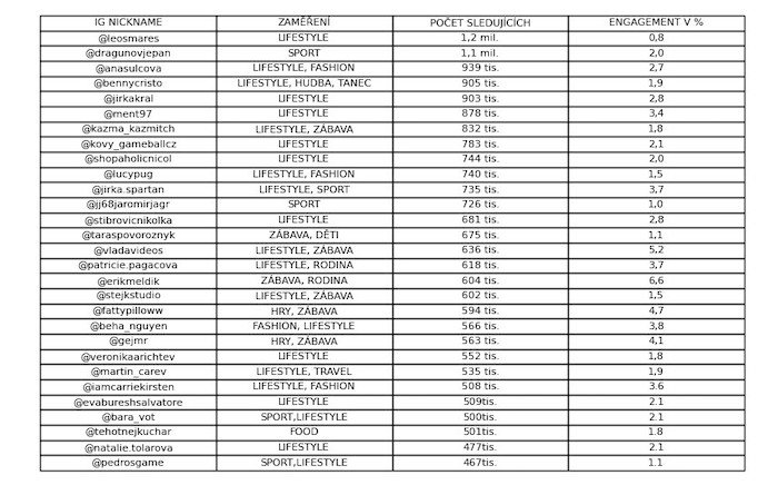 Vedle známých jmen v žebříčku, stojí za zmínku i nové tváře influencer scény, kteří si získávají stále větší pozornost. Patří mezi ně například @martin_mikyska, který extrémně vyrostl po své účasti v reality show Survivor nebo již zmiňovaná @domialagia nebo @gabrielagasparova_official, kteří sice mají menší počet sledujících než zavedené hvězdy, ale jejich engagement rate je výrazně vyšší. I tvůrci s menší komunitou tak mohou mít silný vliv, pokud dokážou vytvořit autentické spojení se svými fanoušky.