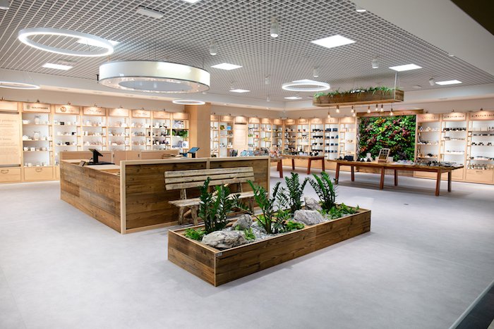 Prodejna, jež se nachází na Terminálu 2, využívá ve svém interiéru dřevo s recyklovanými a repasovanými materiály, mezi něž patří například vinylové podlahy z PET lahví. Součástí jsou i živé rostliny. Design vznikal pod taktovkou nynějších i bývalých studentů Mendelovy univerzity v Brně, vše s ohledem na minimalizaci dopadů na životní prostředí.