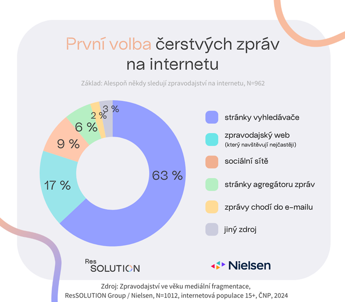 Skoro dvě třetiny uživatelů, kteří sledují online zpravodajství, si pro zpravodajství chodí na stránky vyhledávačů jako Seznam.cz nebo Google. Teprve na druhém místě (a s velkým odstupem) jsou zpravodajská média, a to konkrétně zpravodajský web, který navštěvují nejčastěji. Přímo na něj chodí necelá pětina konzumentů zpravodajství (17 %). 9 % respondentů se jako první podívá na sociální sítě. Vyplývá to ze studie Zpravodajství ve věku mediální fragmentace od agentur ResSolution Group a Nielsen.