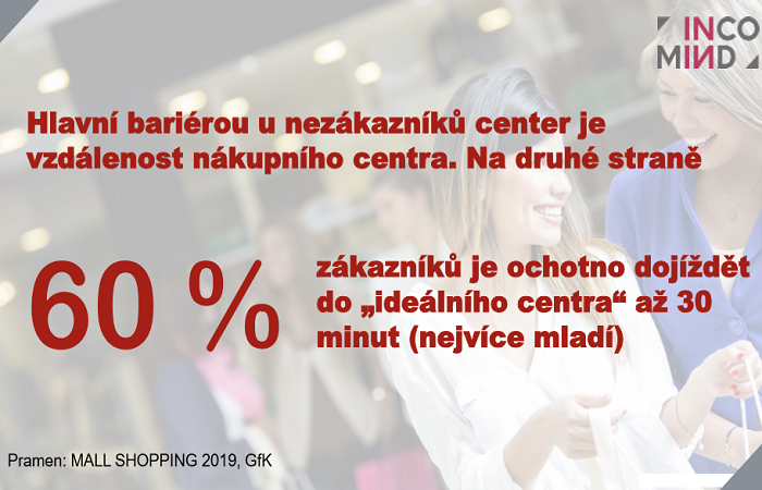 Dnešní zákazník nechce ztrácet čas neproduktivní činností. 55 % motivuje k návštěvě možnost parkování, 50 % snadná orientace v centru a 42 % pak rychlost nákupu. Pro 52 % Čechů je velkou motivací dobrý nákupní mix a přítomnost určitých prodejců. Přičemž ve 110 klasických centrech funguje 2500 různých nájemců. Při nákupu módy 54 % zákazníků jde nejprve do nákupního centra a až pak jinam. Češi utratí 18 % svých výdajů za jídlo v nákupních centrech a u věkové kategorie do 25 let je to dokonce 24 %.