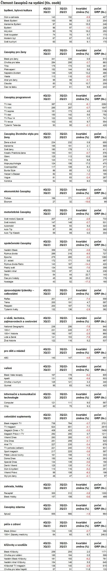Roste čtenost časopisů o informačních a komunikačních technologiích o 9 %, čtenost časopisů o bydlení a bytové kultuře o 4 % a čtenost časopisů životního stylu pro ženy o 2 %.