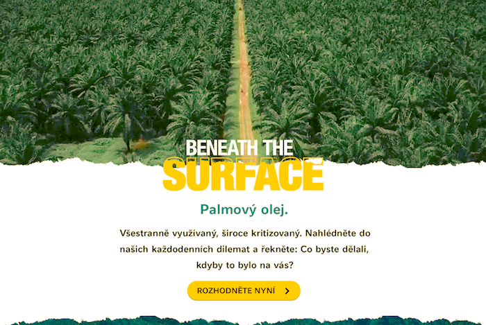 Palmový olej je hned po mase považován za potravinu s největším negativním dopadem na životní prostředí. Problémem však není samotná plodina, ale způsob, jakým je získávána. Nestlé ve své nové kampani „Beneath the Surface“ („Pod povrchem“) zve spotřebitele, aby si na vlastní kůži vyzkoušeli rozhodování dilemat, kterým musí čelit v souvislosti s odpovědným získáváním palmového oleje. Kromě zvýšení povědomí o dilematech v odvětví pěstování palmového oleje je cílem kampaně také vysvětlit, jaké dopady s sebou různá rozhodnutí nesou.