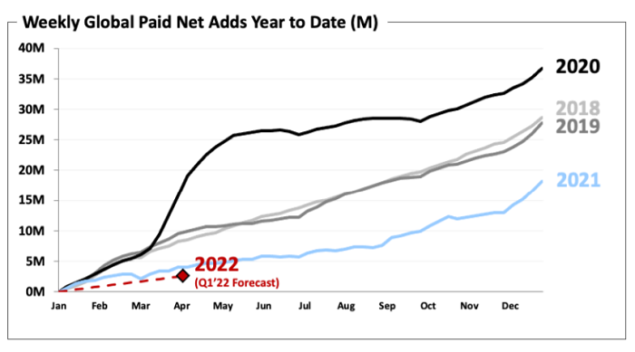 V dopise akcionářům Netflix uvedl, že pokračující pandemie covid-19 a ekonomické těžkosti v několika částech světa zabránily vyššímu růstu počtu předplatitelů. Uvedl také, že je optimistický ohledně dlouhodobého růstu. Ve výhledu na první čtvrtletí 2022 ale odhaduje přírůstek pouze 2,5 milionu předplatitelů, což není ani polovina z toho, co analytici předpokládali. Naznačil rovněž, že kvůli silnější konkurenci, která oslabuje jeho pozici lídra ve streamování videa, čeká pomalejší růst počtu předplatitelů i v novém roce. Také z toho důvodu akcie Netflixu po oznámení výhledu klesly o 20 USD.
