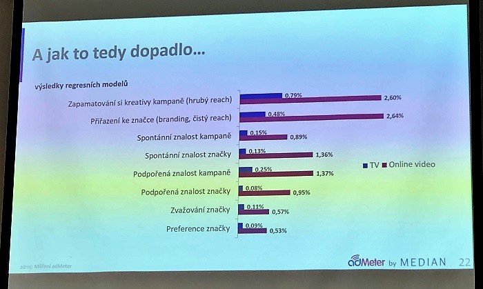 Median použil model vyhodnocení pro online reklamu a televizní reklamu, měření probíhalo na stejném vzorku (otázky před kampaní, po kampani a na kreativu kampaně). Online kampaň zasáhne sice menší část populace (18 %) než TV kampaň (70 %) – data vycházejí z měření adMeter –, z pohledu měřených atributů (např. zapamatování si kreativy, přiřazení kreativy ke značce atp.) je ale online video efektivnější.