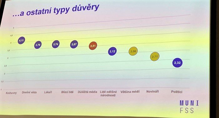 Nový výzkum, který se zabývá měřením důvěry a nedůvěry médií v české populaci, představil na konferenci Jakub Macek, vedoucí mediálních studií a žurnalistiky FSS Masarykovy univerzity v Brně. Jde zatím o první předběžné výsledky, výzkum se uskutečnil letos v lednu a v únoru na vzorku 3 251 respondentů metodou CAPI a CAWI. Vzniká v době, kdy pravidelná šetření ČSÚ dlouhodobě indikují klesající důvěru v česká média. Šetření ČSÚ se však dotazuje pomocí jednopoložkového šetření na důvěru v mediatyp (např. tisk, rozhlas, TV atp.), což má své limity.