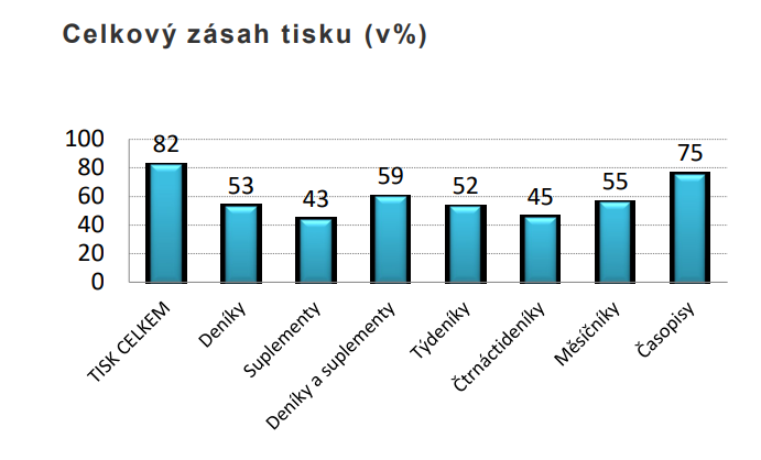 Tištěná média čte 82 % tuzemské populace ve věku 12-79 let, což je více než 7 milionů osob. Čtenářem alespoň jednoho časopisu vydávaného v Česku je 75 % lidí v uvedené věkové skupině, což představuje 6,56 mil. osob. Souhrnný dosah deníků a jejich příloh představuje v delším období 59 % (tj. více než 5 mil. osob). Ukazují to nová data národního výzkumu čtenosti Media projektu za období 1.4. 2022 až 31.3. 2023. Čtenost tisku se zásadně nemění, oproti výsledkům za poslední měřené období je nižší o jeden procentní bod.