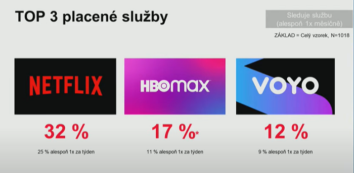 Nejvíce užívanými placenými videoslužbami jsou v Česku Netflix (32 %), HBO Max (17 %) a Voyo (12 %). Pokud se vzorek zúží jen na uživatele, kteří vlastní smart TV, je využívanost placených VOD služeb u těchto diváků vyšší o několik procentních bodů: Netflix (38 %), HBO Max (22 %) a Voyo (15 %).