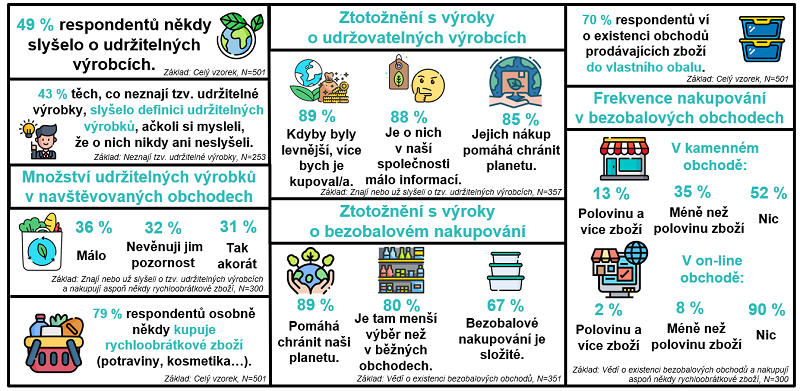 Necelých 40 % lidí, kteří mají povědomí o udržitelných výrobcích a alespoň někdy nakupují rychloobrátkové zboží, se domnívá, že udržitelných výrobků v regálech obchodu je málo. Třetina (31 %) se domnívá, že jejich množství je přiměřené. Třetina respondentů neví, zda v obchodě udržitelné výrobky prodávají, nebo jim zkrátka nevěnují pozornost.