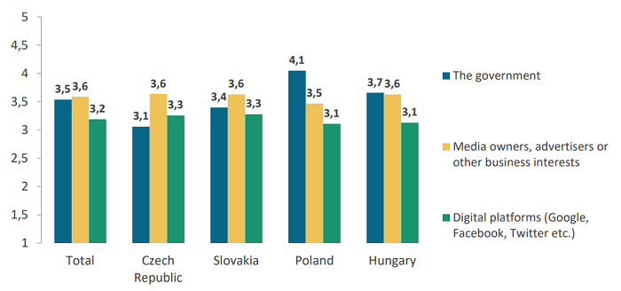 61 % Čechů nesouhlasí s tvrzením, že mediální vlastníci mají právo říkat novinářům, o čem mají psát nebo mluvit. S tímto výrokem naopak souhlasí necelá pětina populace (19 %). V Česku zároveň ze zkoumaných zemí panuje největší nesouhlas s tvrzením, že vlády mají právo ovlivňovat obsah zpravodajství médií veřejné služby. S tímto výrokem nesouhlasí 80 % populace, naopak souhlasí pouze 8 %. Desetina ani souhlasí, ani nesouhlasí.