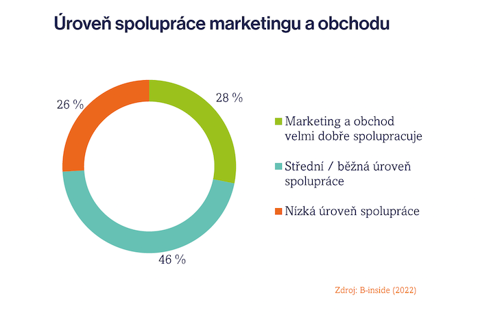 Skutečně dobře marketing a obchod spolupracují přitom jen v 28 % B2B firem. Stejně tak ve čtvrtině firem oba dva týmy jedou samostatně. V 46 % firmách probíhá spolupráce na běžné úrovni.
