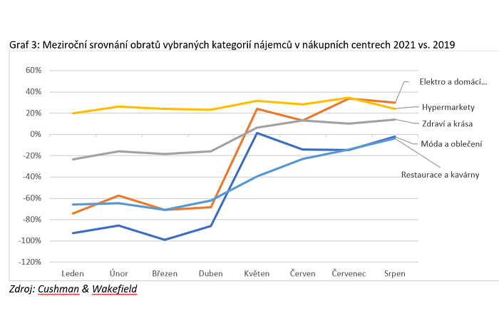 Kategorie zboží, jejichž prodejům v obchodních centrech se v létě dařilo nejlépe, zůstávají stejné jako bezprostředně po znovuotevření. Nejvyšších obratů v červenci a srpnu dosáhli prodejci elektroniky, hypermarkety a obchody se zbožím pro zdraví a krásu. Tyto tři segmenty od května setrvale přesahují hodnoty z předkrizového roku. Naopak převážně pod nimi se drží tržby z prodeje oblečení a také v restauracích a kavárnách v obchodních centrech, ale i u nich od konce restrikcí je patrný pozitivní vývoj a snižování propadu.