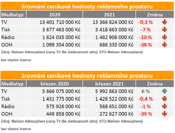 Také údaje za březen 2021, který je z prvního kvartálu tradičně nejsilnějším měsícem na reklamním trhu, ukazují, že televizní reklama si dokonce ve třetím měsíci meziročně polepšila (+6 %). Stagnaci nebo mírný pokles oproti loňskému březnu registroval monitoring v případě tiskové reklamy a reklamy v rádiích. Dvouciferný pokles pak indikuje u venkovní reklamy (OOH).
