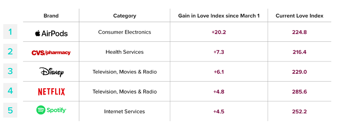 Během pandemie na oblibě u generace Z nejvíce získaly AirPods od Applu (+20,2 bodů), retailer CVS pharmacy (+7,3 bodů, v Česku nedostupný), Disney