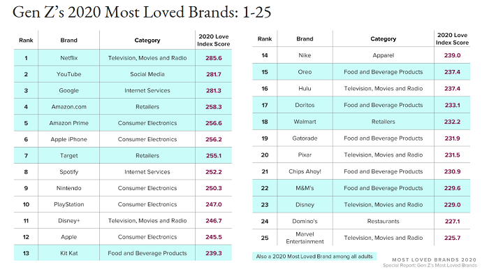 Streamovací služba Netflix se těší mezi mladými vůbec největší oblibě. Hned za ním je videoplatforma YouTube, vyhledávač Google a následuje Amazon a Amazon Prime. V první desítce se potom nachází iPhone od Applu, Spotify, Nintendo a Playstation. Na 11. příčce se umístila relativně nová službě Disney+.