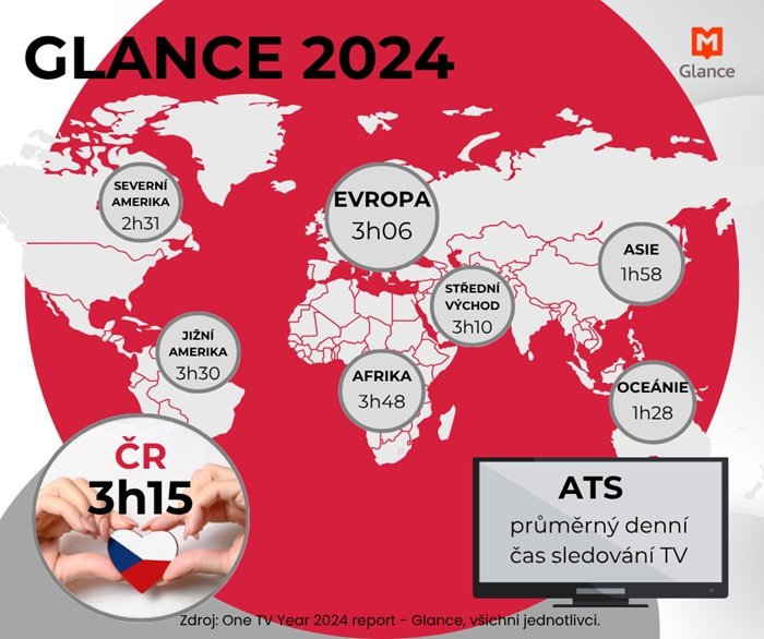 Data z ročenky společnosti Glance, jejíž součástí je i české televizní měření, vypovídají o tom, že i v roce 2024 si Češi udržovali silný vztah ke svým televizním obrazovkám a dokonce sledovali více než průměrný Evropan, uvedla dále ATO. Česko v roce 2024 vykazovalo průměrnou TV sledovanost v cílové skupině 4+ přes tři hodiny denně (cca 3 hodiny a 15 minut), zatímco evropský průměr činil ve stejném roce 3 hodiny a 6 minut.