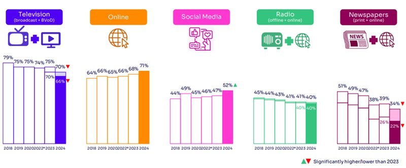 Významným hnacím faktorem zpravodajské konzumace je rostoucí využívání sociálních médií. Více než polovina dospělých ve Spojeném království (52 %) nyní k přístupu ke zprávám používá platformy jako Facebook, YouTube a Instagram. Je to o pět procentních bodů víc než v loňském roce.