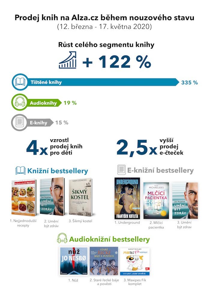 „Na vzniklou situaci se snažíme pružně reagovat, průběžně posilujeme personál a neustále doplňujeme skladovou zásobu. Mezi nejžádanější patří vybavení pro práci z domova – prodeje notebooků a monitorů stouply meziročně o více než 100 %, tiskáren, počítačových komponent a příslušenství o více než 60 %, kancelářských potřeb o 78 %. Celý segment Alza pro firmy vyskočil o 66 %,“ říká obchodní ředitel Alza.cz Petr Bena. Významný nárůst byl zaznamenán i v oblasti trávení volného času: sportovní vybavení (+200 %), papírové a elektronické knihy (+95 %), hry a herní konzole, stavebnice a deskové hry narostly více než trojnásobně a šicí stroje o 301 %.