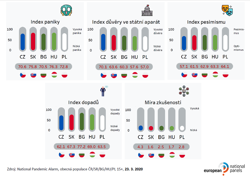 Aktuální postoje a nálady v pandemii koronaviru mapuje projekt National Pandemic Alarm. Probíhá od 16. března 2020 na lokálních reprezentativních online panelech v České republice, na Slovensku, v Polsku, v Maďarsku a v Bulharsku. Jeho výsledky jsou průběžně publikovány na webové stránce www.nationalpandemicalarm.eu. Výzkumný projekt zaštiťuje společnost European National Panels, dceřiná společnost agentur Nielsen Admosphere, NMS Market Research a STEM/MARK, která sdružuje národní panely v zemích Visegrádské čtyřky a v Bulharsku a disponuje v těchto zemích více než 100 tisíci respondenty.