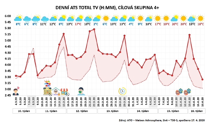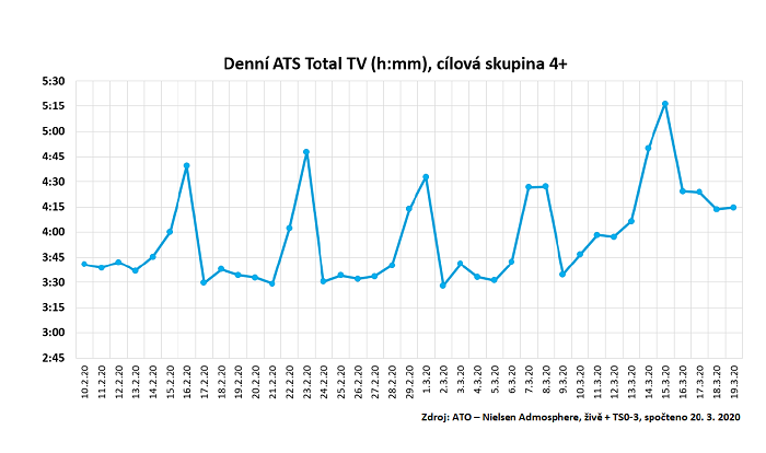 Průměrná denní doba strávená před televizní obrazovkou (ATS) představovala v letošním květnu v průměru 3 hodiny a 49 minut. Poté, co v březnu vystoupala na rekordních 4:38 hodin a v dubnu se ještě udržela nad úrovní čtyř hodin denně (4:08), potvrzují květnová data návrat k hodnotám před pandemií. Průměrná doba sledovanosti v letošním květnu je ale stále vyšší než v loňském květnu, a to o více než šest minut denně.