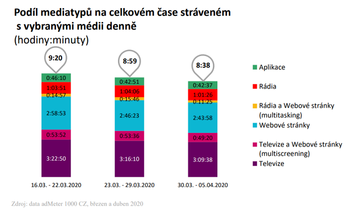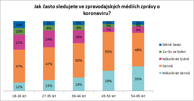 Dominantním zdrojem informací o koronaviru a opatřeních proti jeho šíření je televize. Vyplývá to z výzkumu Nielsen Admosphere, který zpracovala pro Asociaci komunikačních agentur (AKA). Uvedla to polovina respondentů, čtvrtina čerpá ze zpravodajských webů. Jen přibližně desetina pokládá za nejdůležitější zdroj weby státních institucí. Televizní zpravodajství je hlavním zdrojem informací především pro lidi starší 55 let. Generace 18-34 upřednostňuje zpravodajské weby.