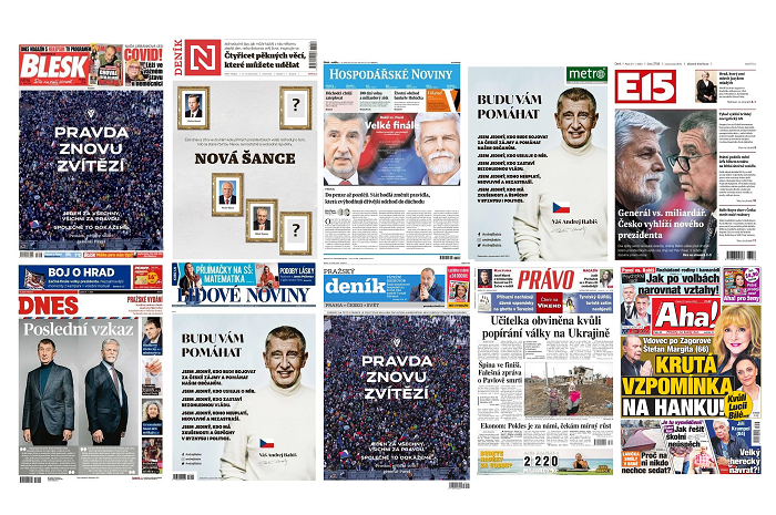 Ostatní deníky vycházejí s redakčními titulními stranami. MF Dnes (Mafra) má na titulní straně fotografie obou kandidátů s krátkým apelem k voličům a uvádí je titulkem „Poslední vzkaz". Portréty obou kandidátů se objevují i na titulních stranách Hospodářských novin (Economia) a deníku E15 (Czech News Center) s titulky „Velké finále" a „Generál vs. miliardář. Česko vyhlíží nového prezidenta". Deník N (N media) pojednal titulní stranu portréty bývalých prezidentů, přičemž dvě místa nechává s otazníkem. Ilustraci uvádí titulkem „Nová šance". Nejméně prostoru na titulní straně věnuje prezidentským volbám deník Právo (Borgis), který se vrací ke čtvrteční falešné zprávě o Petru Pavlovi s titulkem „Špína ve finiši".