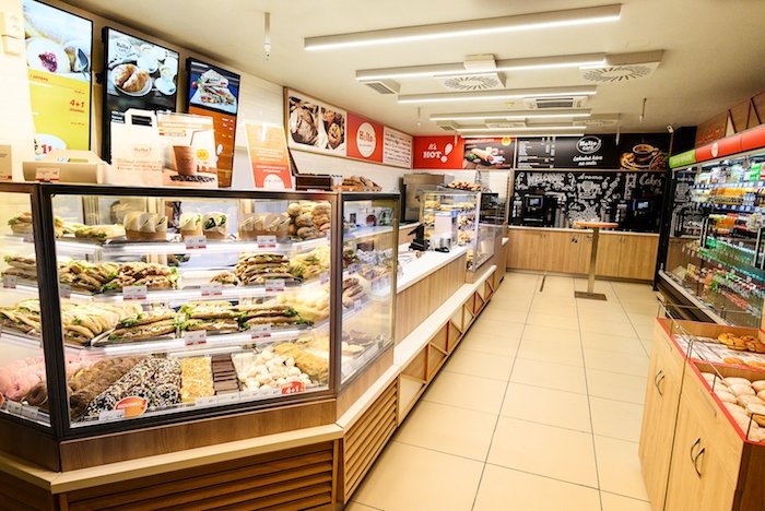 Zde jsme vypíchli tři hlavní kategorie, pečivo, kávu a hotová jídla. Kávu jsme si definovali jako samostatnou kategorii a vytvořili jsme barevně oddělený prostor s názvem „Hello café“. Nabídku produktů jsme se pak snažili sjednotit, aby byla v celé síti stejná. V jednotlivých kategoriích jako jsou bagety a sendviče jsme vytvořili lepší produkty, než byly dřív. Červeně pak máme odlišený „hot food“ koutek, kde nabízíme párky v rohlíku a další teplé svačiny.