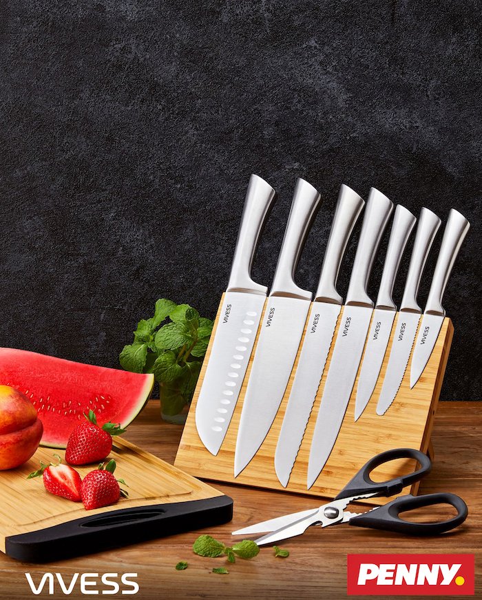 V rámci akce nabízí Penny kolekci sedmi nožů od univerzálního nože, přes nože na rajčata, na loupání, na chleba, na maso až po Santoku nůž. Doplňují je kuchyňské nůžky, protiskluzové dřevěné prkénko a bambusový blok na nože s magnetickou úchytkou pro uložení všech sedmi nožů.