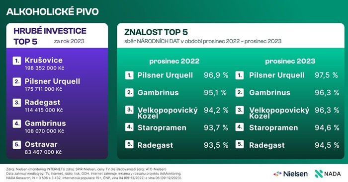 Za rok 2023 do reklamy nejvíce investovala značka Krušovice, nejznámější značkou je ale Pilsner Urquell. Ukazují to národní data NADA, která porovnávají výši investic do reklamy a znalost značky. „Meziročně si Krušovice sice polepšily, ale stále ztrácí na pátý Radegast kolem 1 p. b. znalosti,“ uvedl Martin Chalupník z NADA Research.