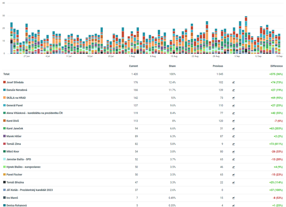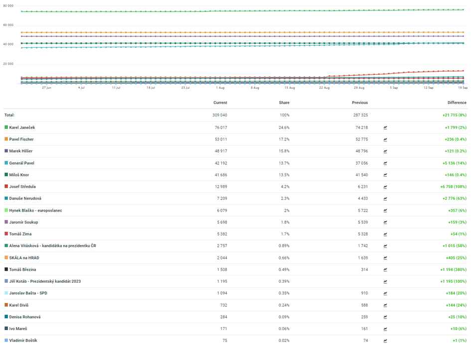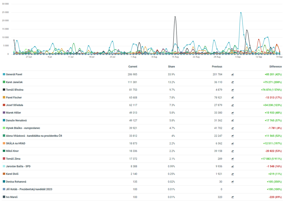 Přehled sledovaných kandidátů vychází ze seznamu serveru E15.cz a kategorie „Potvrzení kandidáti na prezidenta" ke dni 22. září 2022. Autor tohoto článku našel k tomuto dni v podobě stránek (nikoliv osobních profilů) facebookové prezentace všech uvedených kandidátů s výjimkou Jakuba Olberta, ten tedy není v přehledu zahrnut. Jinak jsou v přehledu zahrnuti Petr Pavel, Josef Středula, Karel Janeček, Marek Hilšer, Danuše Nerudová, Tomáš Zima, Alena Vitásková, Tomáš Březina, Jaromír Soukup, Karel Diviš, Miloš Knor, Denisa Rohanová, Ivo Mareš, Vladimír Boštík, Josef Skála, Hynek Blaško, Jiří Kotáb a Jaroslav Bašta. Data jsou čerpána z platformy Zoomsphere.