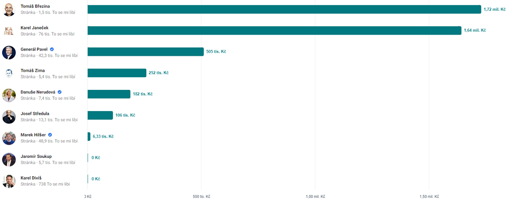 Pojďme od obsahu k reklamě, což jsou dnes nejen na Facebooku, ale i na ostatních sociálních sítích, dvě spojité nádoby. Zkrátka bez reklamy dnes na sítích moc parády se svým obsahem neuděláte. A ač nemusí vždy automaticky kvantita znamenat také kvalitu, z dat veřejné knihovny reklamy Mety za sledované období plyne, že nejvíce do reklamy na této platformě investoval Tomáš Březina (1,7 milionu Kč). V závěsu za ním je Karel Janeček (1,65 milionu Kč) a s odstupem potom Petr Pavel (0,5 milionu Kč).