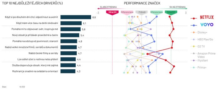 Na českém trhu je Netflix silný napříč téměř všemi drivery. Lidé si ho spojují se službou, kterou rádi využijí, když si chtějí po dlouhém dni odpočinout a uvolnit nebo když mají více času na delší sledování. Také jej vnímají jako hráče, který jim pomáhá objevovat svět a inspiruje je. Jediným driverem, kde pokulhává, je nabídka českých filmů a seriálů, kde se podařilo prosadit Voyu.