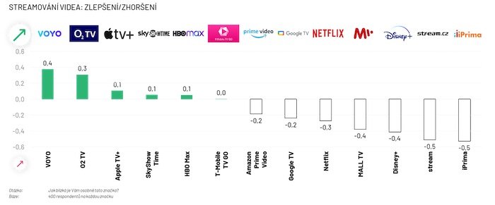 Voyo si v očích Čechů za posledních 12 měsíců také nejvíce polepšilo. Oproti tomu Netflix se podle spotřebitelů meziročně zhoršil.