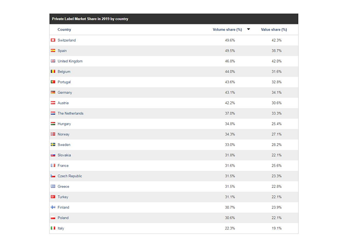 Itálie je aktuálně jedinou zemí, kde zůstává podíl privátních značek v rámci nabídky pod 30 %, konkrétně 22,3 % a podíl na prodejích tvoří jen lehce přes19 %. I přestože vzrostl jejich podíl na trhu o více než 2 %, zůstává Itálie hodně vzadu za Švýcarskem. Tam tvoří privátní značky téměř polovinu nabídky se 49,8 % a co se podílu na prodejích týče je to 42,5 % a to i přes menší pokles v loňském roce.