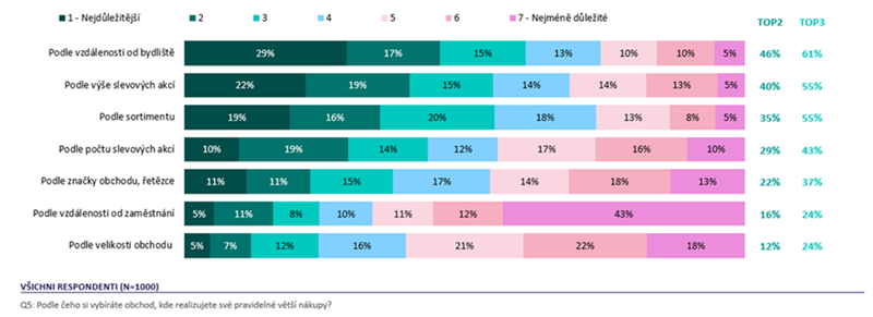 Pro výběr obchodu, kde Češi realizují své pravidelné větší nákupy, je rozhodujícím faktorem vzdálenost od bydliště (61 % odpovědí). Platí to především pro lidi ve věku 66-75 let a z větších měst včetně Prahy. Většina spotřebitelů se při výběru řídí také výší slevových akcí, zejména pro mladou generaci 18-35 let či ženy, a sortimentem (shodně 55 % odpovědí). Značka řetězce či obchodu je důležitá pro 37 % Čechů a velikost prodejny jen pro 24 %.