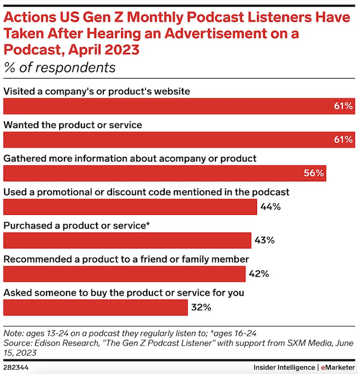 Reklama v rámci podcastu je nejen poslouchána, ale podněcuje také k akci. Podle výzkumu Edison Research zavítalo až 61 % posluchačů z generace Z po poslechu reklamy na webové stránky zadavatele nebo propagovaného produktu. Stejný podíl po daném produktu nebo službě zatoužilo. Přes polovinu posluchačů (56 %) si o propagované společnosti či produktu začalo shánět více informací. Téměř polovina (44 %) využila promo kód zmíněný v podcastu, 43 % si komunikovaný produkt či službu zakoupilo a 42 % jej doporučilo svým blízkým.