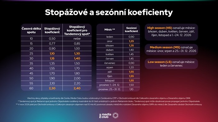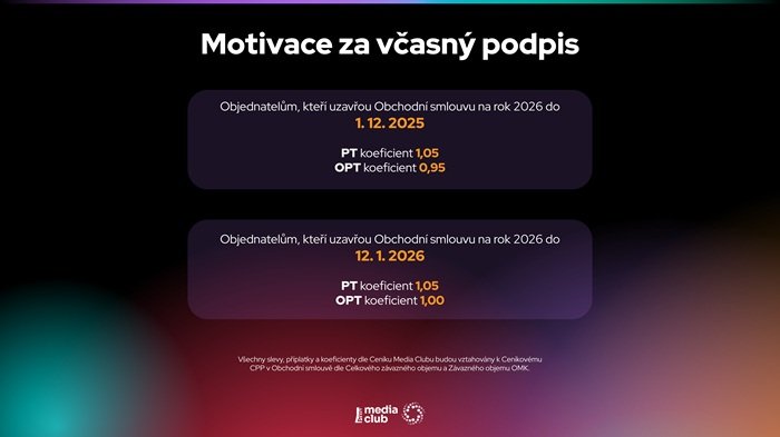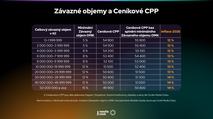 Media Club zároveň zavádí prémiové video jako nový standard digitální reklamy, s cenami 530–730 Kč za CPT a meziročním růstem ceny o 6–8 %.