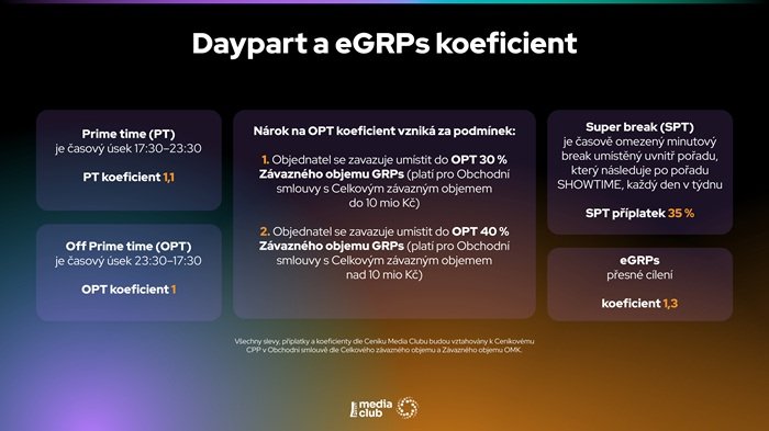 Cena CPP za 30vteřinový spot vzroste o 12–14 %, zároveň se upravují příplatky a koeficienty, například super break z 25 % na 35 % a nově se zavádí příplatek 10 % u prémiového reklamního prostoru označovaného jako Prima Premium program. Základní nákupní cílová skupina 18–69 let se nemění, stejně jako portfolio zastupovaných stanic, včetně skupin TV Barrandov a Óčko. Klienty firma motivuje k včasnému podpisu smlouvy zvýhodněnými daypart koeficienty.