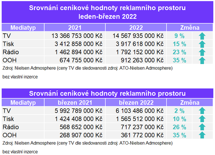 Nejvyšší nárůsty oproti prvnímu čtvrtletí 2021 zaznamenala venkovní reklama (+35 %) a reklama v rádiích (+23 %). Dařilo se ale i reklamě v tištěných titulech (+15 %) a také v televizi (+9 %).